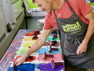 Simon Ripley is a Founder Director of the Double Elephant Print Workshop, based in Exeter, SW England. He comes from a family of commercial printers for the wine trade and grew up in the world of multi-colour, embossed and gold blocked labels for Chivas Regal Scotch Whisky or Beefeater Gin. Inheriting an 1850’s Columbian Relief Press from a stationery printer’s factory in Perth, Scotland set him on a journey for life and was the starting point for Double Elephant. He specialised in Fine Art printmaking, with teachers Graham Clucas and Steve Thorpe at Plymouth University and became especially interested in the woodcuts of Helen Frankenthaler: in particular ‘Essence Mulberry’ and ‘Savage Breeze’; her use of surface, colour and fine Japanese papers. The simple power of Munch’s prints, the politics in Tàpies and the abstract printmaking of Ian McKeever are all important influences.